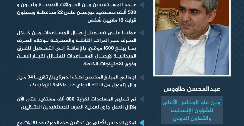 عبدالمحسن طاووس أمين عام المجلس الأعلى للشؤون الإنسانية والتعاون الدولي: عدد المستفيدين من الحوالات النقدية مليون و500 ألف مستفيد موزعين على 22 محافظة ويعيلون قرابة 10 ملايين شخص t.me/AnsarAllahINFO ‏ #إنفوجرافيك_أنصارالله‏