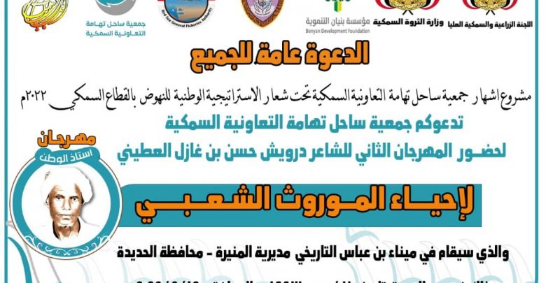 وتأتي النسخة الثانية من المهرجان الذي تنظمه جمعية ساحل تهامة التعاونية السمكية تحت شعار “الاستراتيجية الوطنية للنهوض بالقطاع السمكي 2022م” بالتنسيق مع السلطة المحلية بالمحافظة واللجنة الزراعية السمكية العليا ووزارة الثروة السمكية ومؤسسة بنيان التنموية، استمراراً للفعاليات الهادفة إحياء الموروث الشعبي التهامي.