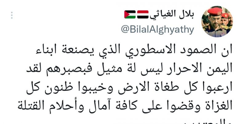 #بلال_الغياثي | ‏ان الصمود الاسطوري الذي يصنعه ابناء اليمن الاحرار ليس له مثيل فبصبرهم لقد ارعبوا كل طغاة الارض وخيبوا ظنون كل الغزاة وقضوا على كافة آمال وأحلام القتلة والمعتدين