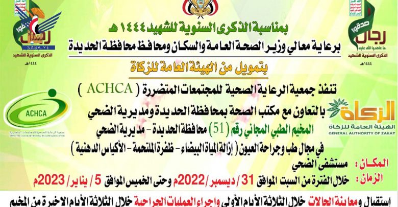 تدشن جمعية الرعاية الصحية للمجتمعات المتضررة، غداً السبت، المخيم المجاني الـ51 لطب وجراحة العيون بمديرية الضحي محافظة الحديدة بالتنسيق مع وزارة الصحة العامة والسكان، وبتمويل الهيئة العامة للزكاة.