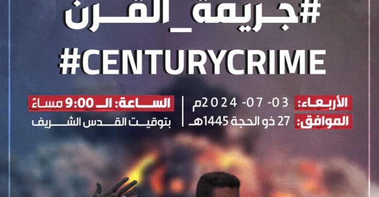 غزة قصة الحق في وجه الباطل معركة امتحان الإنسانية والإيمان لن تمر الجرائم ويجب أن لا نسمح بموت الضمائر شارك في حملة التغريدات المشتركة عربياً وعالمياً لفضح الصهيونية بالهاشتاقات: #جريمة_القرن #CenturyCrime الأربعاء الـ 9:00م بتوقيت القدس الشريف 03-07-2024م الموافق: 27 ذي الحجة 1445هـ بنك التغريدات: bit.ly/cntrcrim