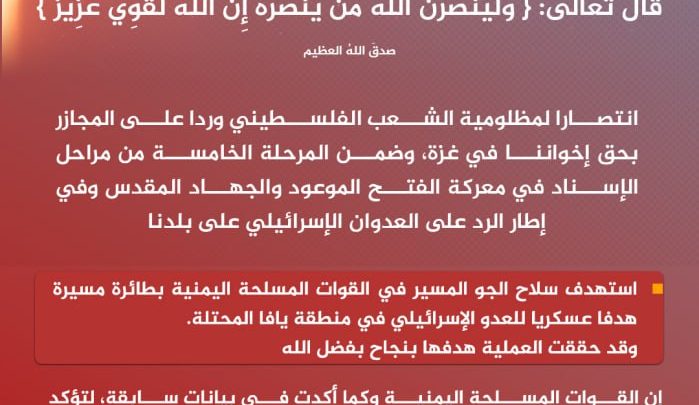 بيان القوات المسلحة اليمنية بشأن تنفيذ سلاح الجو المسير عملية استهدفت هدفا عسكريا للعدو الإسرائيلي في يافا المحتلة