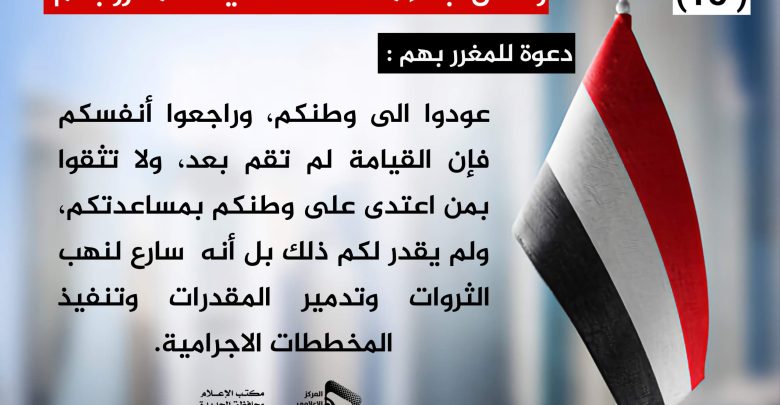 عودوا الى وطنكم، وراجعوا أنفسكم فإن القيامة لم تقم بعد، ولا تثقوا بمن اعتدى على وطنكم بمساعدتكم، ولم يقدر لكم ذلك بل أنه  سارع لنهب الثروات وتدمير المقدرات وتنفيذ المخططات الاجرامية.