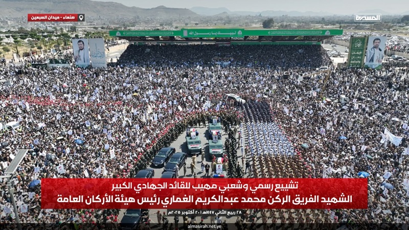 في صباحٍ عسكريّ الملامح، مهيبِ النبرة، ارتفعت الهتافات في ميدان السبعين كما لو كانت أوامر ميدانٍ تصدر من ضمير الوطن ذاته، واختلطت صيحات التكبير بأصوات الحزن والفخر وهي تودّع الشهيد الفريق الركن محمد عبد الكريم الغماري؛ القائد الجهادي الكبير الذي قاد الميدان بعقيدته القرآنية قبل سلاحه، وبإيمانه قبل رتبته، وبولائه قبل خبرته، وبإبداع غير الاستراتيجيات والمعادلات.