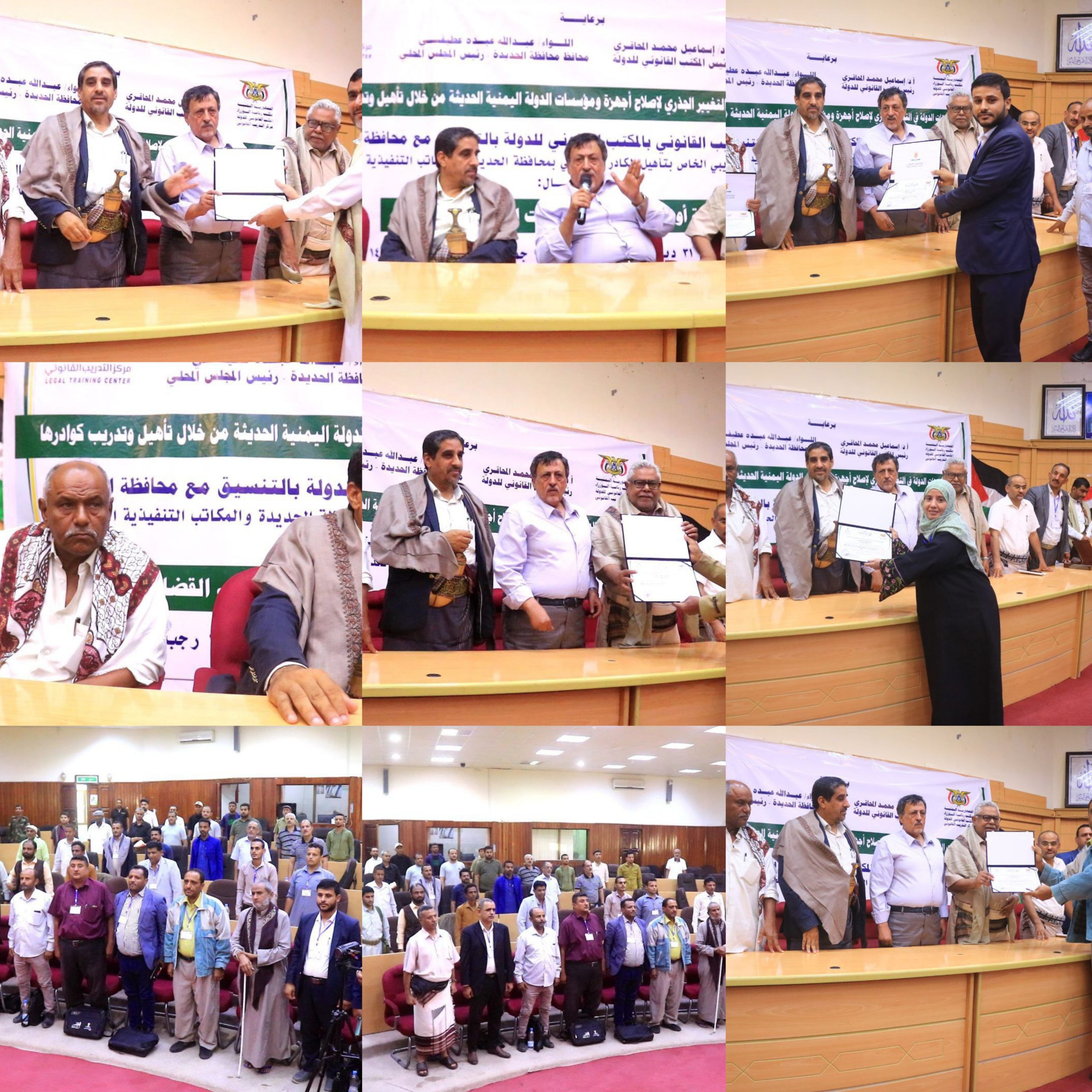 اختُتم بمحافظة الحديدة، اليوم، البرنامج التدريبي الخاص بتأهيل وتدريب الكادر القانوني بديوان المحافظة والإدارات القانونية بالمكاتب التنفيذية والهيئات الحكومية.