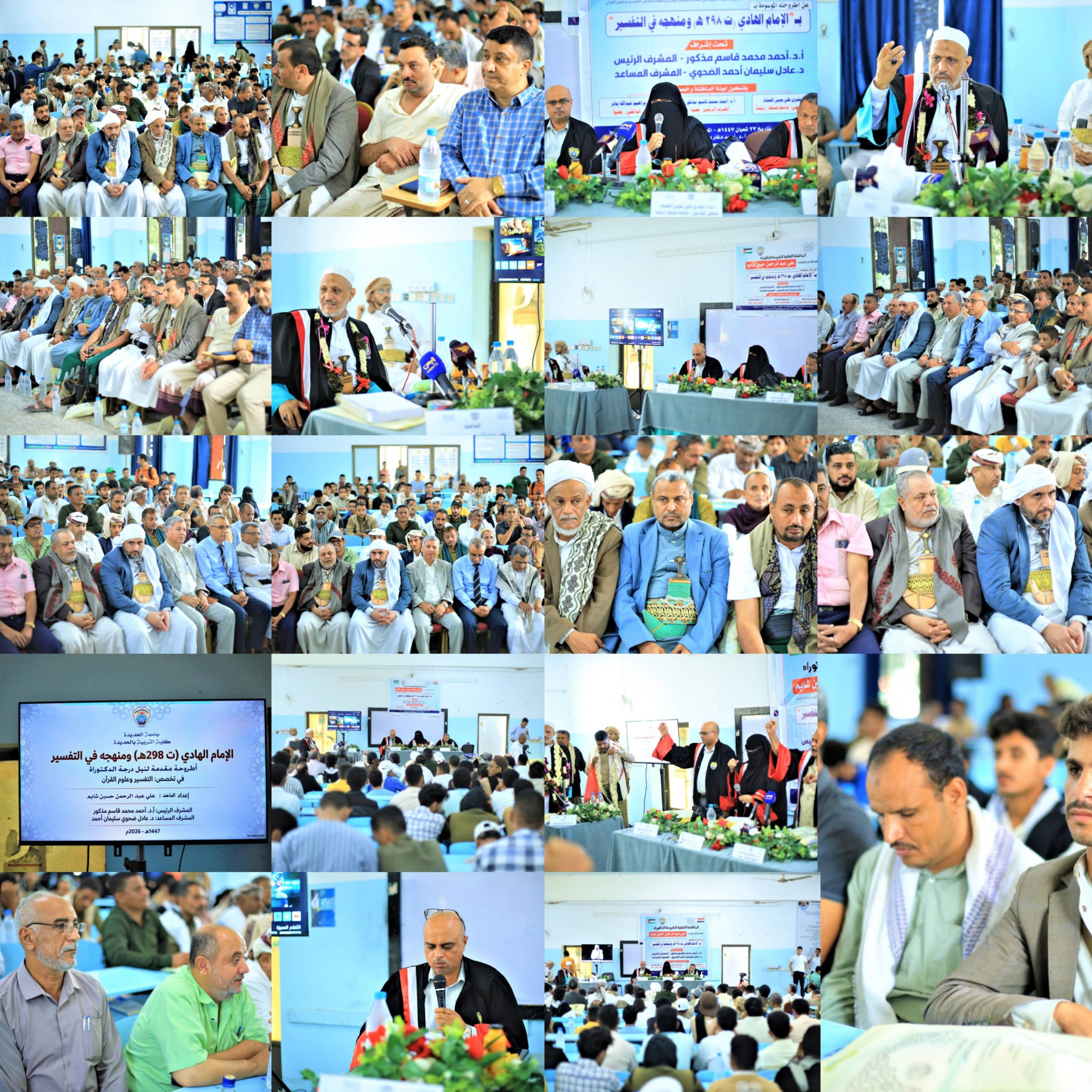 في إطار الحراك العلمي والبحثي الذي تشهده جامعة الحديدة وبرعاية وحضور الأستاذ / عبدالباسط الهادي محافظ محافظة صنعاء والأستاذ/ أحمد البشري وكيل أول محافظة الحديدة و الأستاذ الدكتور / محمد أحمد الأهدل رئيس الجامعة و الأستاذ الدكتور/ محمد حمد بلغيث نائب رئيس الجامعة للدراسات العليا والبحث العلمي، أقيمت في صباح يومنا هذا الأربعاء المناقشة العلنية لأطروحة دكتوراة بقسم القرآن الكريم وعلومه تخصص التفسير وعلوم القرآن بكلية التربية الحديدة الموسومة ب: ( الإمام الهادي (ت298ه) ومنهجه في التفسير) مقدمة من الباحث/ علي عبدالرحمن حسين شايم, تحت إشراف:
