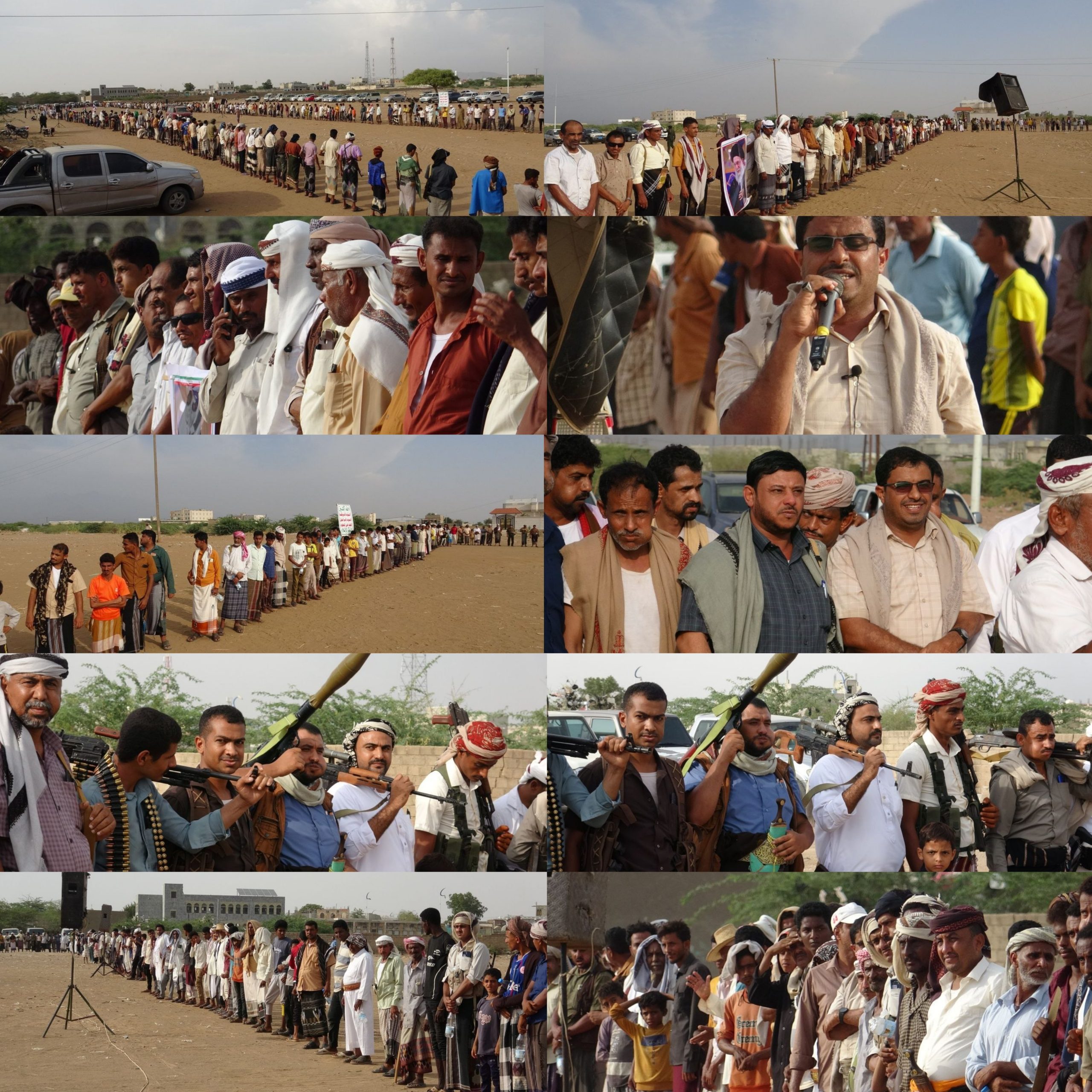 ورفع المشاركون في الوقفة، التي تقدّمها وكيل المحافظة غالب حمزة وقيادات السلطة المحلية والتعبئة وشخصيات اجتماعية، العلمين اليمني والفلسطيني، مرددّين هتافات الجهوزية والنفير العام.