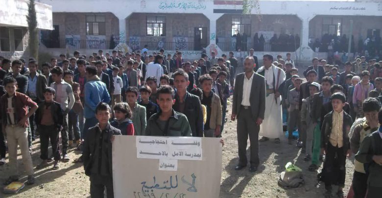 ورفعت خلالها الشعارات المنددة والمناهضة للعدوان الغاشم على بلادنا واستهدافه للعملية التعليمية والتربوية ومحاولة عرقلتها، واستنكرت التطبيع مع الكيان الصهيوني.