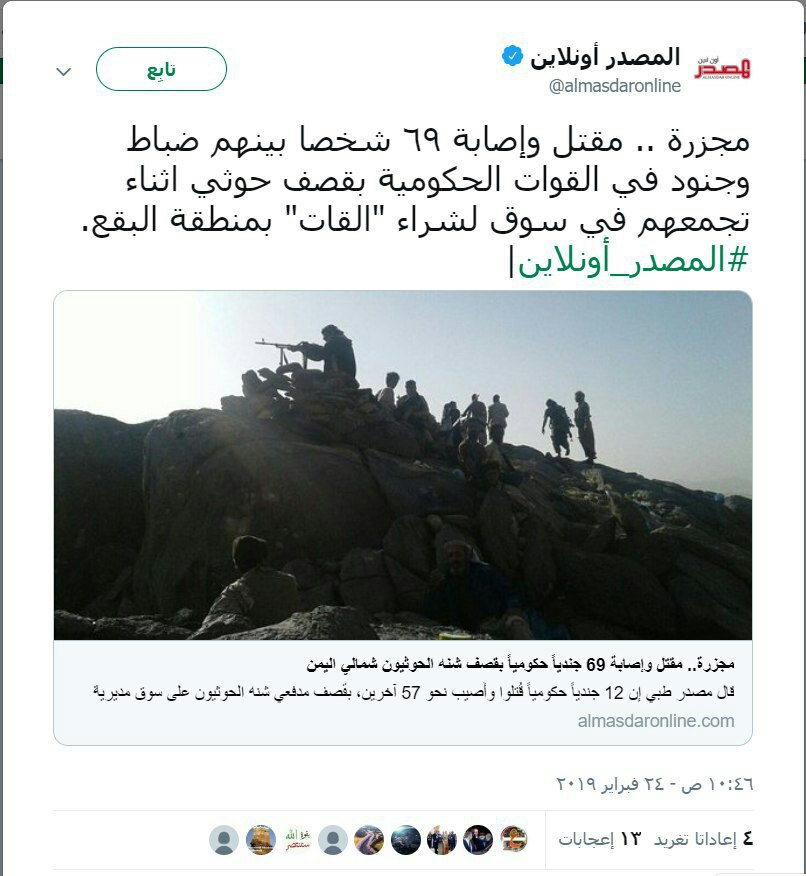 وكشف موقع المصدر أونلاين الموالي للعدوان نقلا عن مصادر طبي عن إحصائية مهولة للخسائر البشرية التي تكبدها العدو بلغت قرابة80 مرتزق وقعوا بين قتيل وجريح بينهم قيادات في الضربة المسددة.