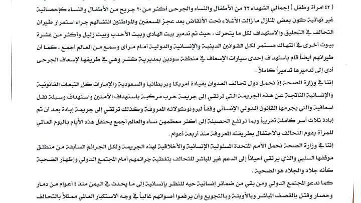 إننا في وزارة الصحة إذ نحمل دول تحالف العدوان بقيادة أمريكا وبريطانيا والسعودية والإمارات كل التبعات القانونية والإنسانية الناتجة عن هذه الجريمة التي ترتقي إلى جريمة حرب مركبة بأستهداف الآمنين واستهداف وسيلة نقل اسعافية والتي يجرمهما القانون الدولي الإنساني وفقا لبروتوكولاته المعروفة وكذلك ترتقي الى جريمة إبادة بعد أن تم إبادة ثلاث اسر كاملة تقريبا وربما ترتفع الحصيلة إلى اكثر معظمهن نساء والعالم اجمع يحتفل هذه الايام باليوم العالمي للمرأة يقوم التحالف بالأحتفال بطريقته المعروفة منذ اربعة أعوام .
