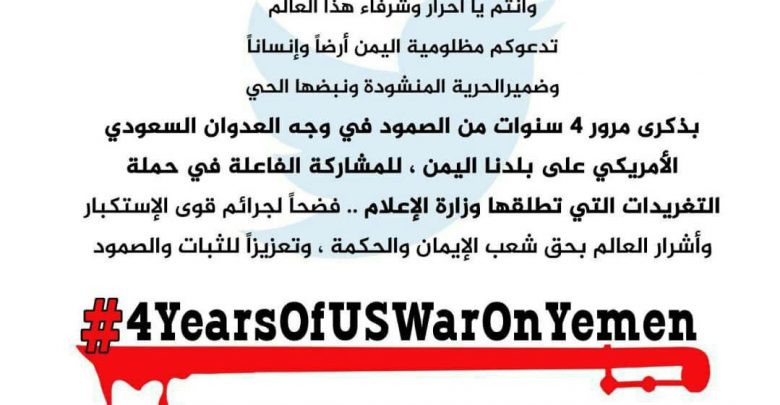 في ذكرى مرور 4 سنوات من العدوان الأمريكي السعودي على #اليمن تدعوكم وزارة الإعلام للمشاركة الفاعلة في حملة التغريدات والتي تهدف لفضح جرائم العدوان بحق الشعب اليمني على الهاشتاق: