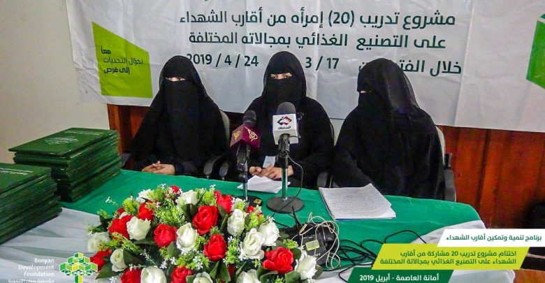 وهدف المشروع التدريبي خلال الفترة من 17 مارس – 24 أبريل 2019م، إلى اكساب 20 مشاركة من أقارب الشهداء عدد من المهارات والخبرات حول كيفية تصنيع و إنتاج العصائر ، الصلصة ، الشطة ، المعجنات، والمربيات والمخللات.