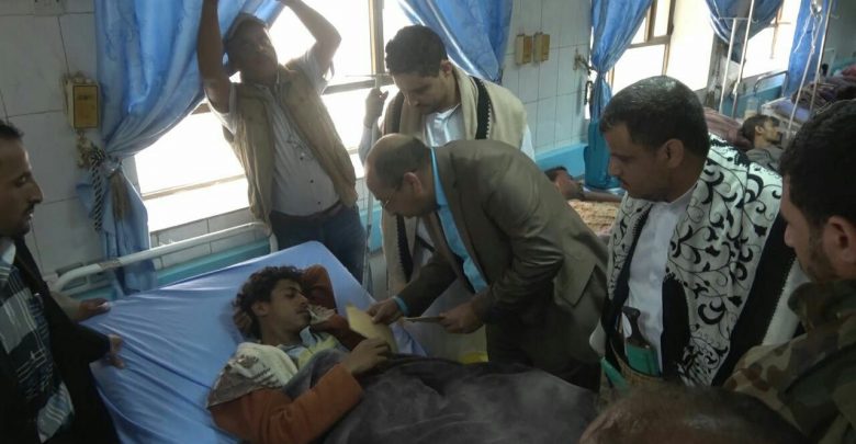 زار اليوم وفد من وزارة التربية والتعليم برئاسة نائب وزير التربية الدكتور همدان الشامي جرحى الجيش واللجان الشعبية في مشفى الثورة العام بمحافظة إب .
