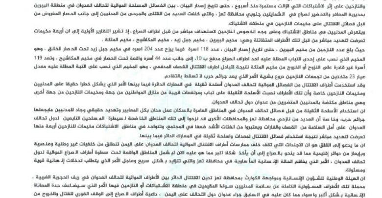 بيان الهيئة الوطنية لإدارة وتنسيق الشؤون الإنسانية ومواجهة الكوارث – تعز بشأن أحداث الاقتتال فيما بين فصائل العدوان في مديريتي المعافر والشمايتين