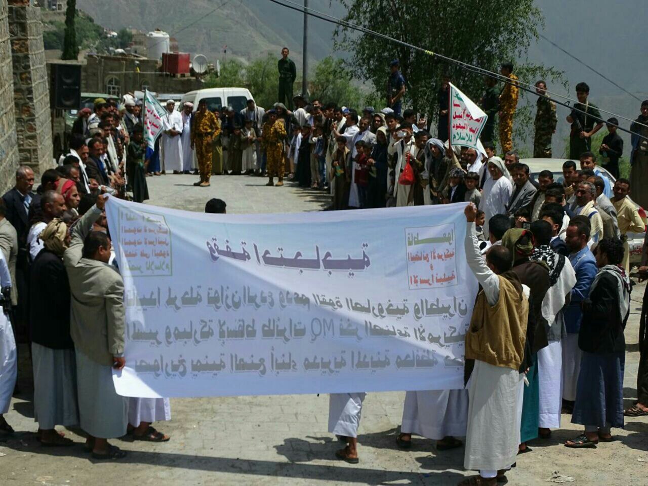 نظم ابناء وعقال ومشائخ حارتي الحسوي والجراف بمربع الشهيد طه المحطوري بحجة اليوم الجمعة وقفة احتجاجية مسلحة تنديدا واستنكار بجرائم العدوان السعودي الامريكي الاماراتي ومرتزقته وتأييدا لمرحلة توازن الردع ودعما لسلاح الجو المسير والقوه الصاروخية وعليهم بالضرب بيدا من حديد في عمق العدوان السعودي الامريكي.