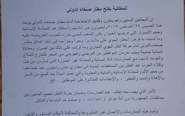 إن المحامين اليمنيين وهم ينفذون وقفتهم الإحتجاجية أمام مطار صنعاء الدولي يومنا هذا الخميس 29 أغسطس 2019م ليعبرون عن إدانتهم واستنكارهم للمعاناة الإنسانية وحجم الأضرار التي فرضها العدوان على الشعب اليمني جراء الحرب المفروضة عليه وما تسببت به فرض الحظر الجوي على بلادنا براً وبحراً وجواً بما في ذلك إغلاق مطار صنعاء،الدولي أمام حركة النقل الجوي التجاري وما ترتب على ذلك من أضرار ومعاناة إنسانية جسيمة بسبب حرمان المواطنين من المرضى والجرحى من السفر للخارج للعلاج والعودة، لاسيما مع الممارسات اللا إنسانية والمعاناة غير المبررة التي تمارس من قبل وكلاء الحرب عند التنقل بين المحافظات اليمنية إلى مطاري عدن وسيئون مما يضاعف من حجم الألم والمعاناة الإنسانية والمادية والمعنوية والتي تصل أحياناً حد المنع من السفر والإهانة والسب والتحقير ، والإعتداءات المباشرة على الموطنين … إلخ .