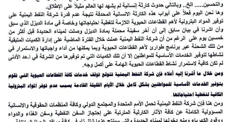 ومن خلال ما أشرنا إليه أعلاه فإن شركة النفط اليمنية تتوقع توقف خدمات كافة القطاعات الحيوية التي تقوم بتوفير الخدمات الأساسية للمواطنين بشكل كامل خلال الأيام القليلة القادمة بسبب عدم توفر المواد البترولية الكافية لتغطية احتياجاتها.