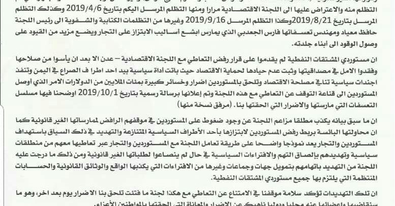 ان مستوردي المشتقات النفطية لم يقدموا على قرار رفض التعاطي مع اللجنة الاقتصادية – عدن الا بعد ان يأسوا من صلاحها وفقدوا الامل في مصداقيتها وثبت عدم حيادها لحماية الاقتصاد حيث باتت أداة سياسية بيد احد اطرا ف الصراع في اليمن وتنفذ اجندات سياسية تنافي مصلحة الاقتصاد وتلحق بالمستوردين اضرار وخسائر كبيرة بمئات الملايين من الدولارات الامر الذي أوصل المستوردين الى قناعة التوقف عن التعاطي مع هذه اللجنة وتم إعلانها برسالة رسمية بتاريخ 1/10/2019 اوضحنا فيها مسلسل التعسفات التي مارستها والاضرار التي الحقتها بنا. (مرفق نسخة منها)