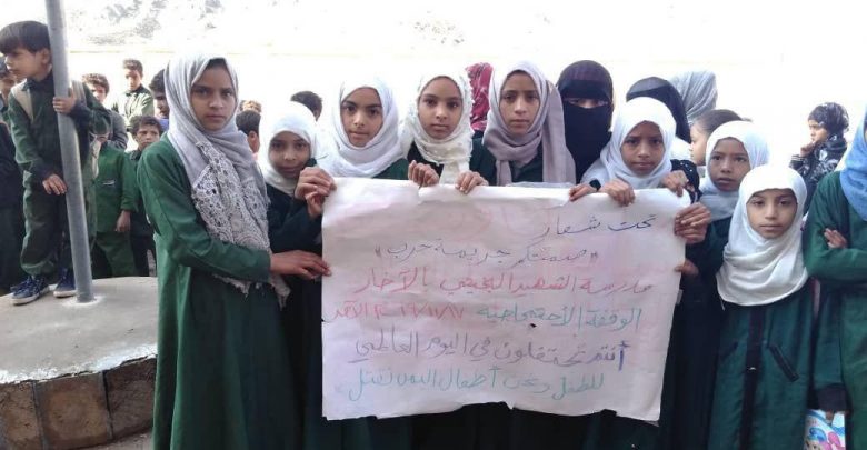 وقفات احتجاجية ضد الانتهاكات لحقوق أطفال اليمن من قبل العدوان السعودي الأمريكي تمثلت في منع دخول الأدوية والحليب المخصص للأطفال وقطع الرواتب وهدم المدارس وضرب الحافلات المدرسية.