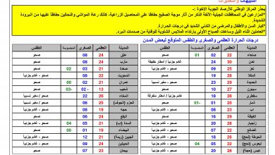 توقع المركز الوطني للأرصاد الجوية استمرار الأجواء شديدة البرودة مع احتمال تكون الصقيع على بعض المناطق المرتفعة من محافظات صعدة،…