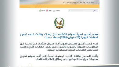 هاااااااااااام مصدر أمني لسبأ: سيتم الكشف عن جهات وقفت خلف تدمير الدفاعات الجوية [26/ فبراير/2020] صنعاء – سبأ: صرح مصدر أمني مسئول اليوم، أنه سيتم الكشف عن جانب من المعلومات السرية بالصوت والصورة عن بعض الجهات التي وقفت خلف تدمير الدفاعات الجوية للجمهورية اليمنية. وأشار المصدر لوكالة الأنباء اليمنية (سبأ) إلى أنه سيتم توزيع معلومات حول هذا الموضوع على وسائل الإعلام المختلفة.