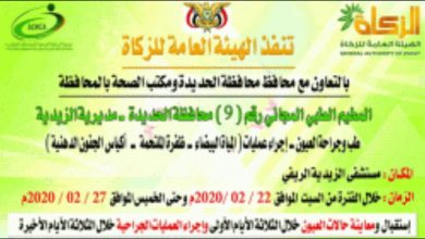 [20/فبراير/2020] #صنعاء – سبأ : تدشن الهيئة العامة للزكاة بالتعاون مع جمعية الرعاية الصحية للمجتمعات المتضررة بعد غد السبت بمستشفى…