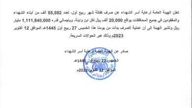 أعلنت الهيئة العامة لرعاية أسر الشهداء مساء اليوم الخميس صرف كفالة شهر ربيع الأول للعام 1445ﮪ لعدد 55.592 من أبناء…