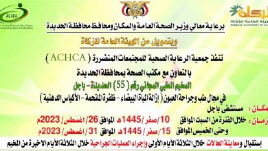 الجمعة، 09 صفر 1445هـ الموافق 25 أغسطس 2023 الحديدة | تهامة نيوز تدشن جمعية الرعاية الصحية للمجتمعات المتضررة، غداً السبت…