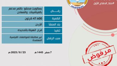 تهامة نيوز – صنعاء – 10 صفر 1445هـ رفضت الهيئة اليمنية للمواصفات والمقاييس وضبط الجودة عبر فرعها في الحديدة، دخول…