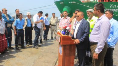 مؤتمر صحفي بأرصفة ميناء الحديدة بالتزامن مع وصول عدة سفن